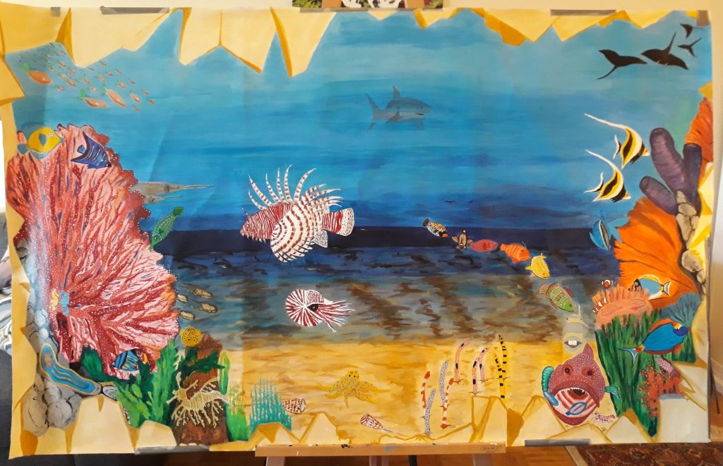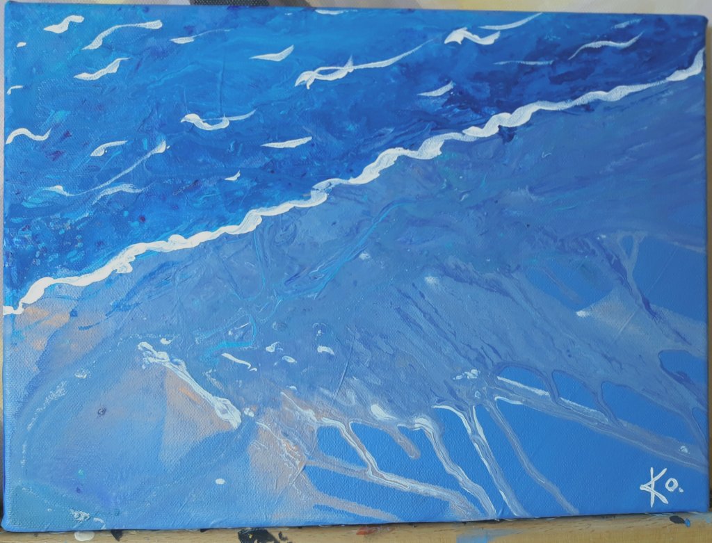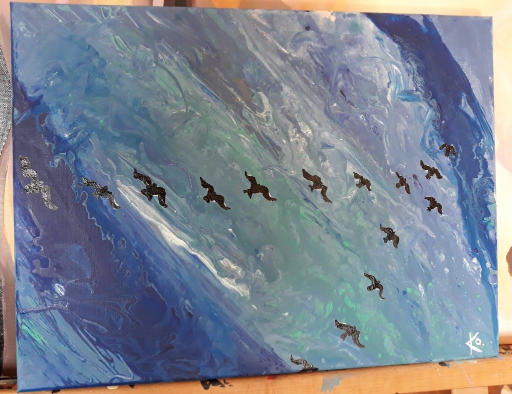 Inte min vanliga stil. Kul att utmana sig själv! Ändå ganska färgrik och det blev ju lite djur igen. 😊 Lättare att måla abstrakt än mer realistiskt. Men blev rätt bra till slut.