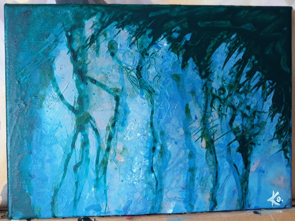 Några av de tavlor jag testade den nya tekniken på målade jag vidare på. Utgick ifrån den känsla jag fick av det möster som skapades. Så här blev slutresultatet. 🙂
