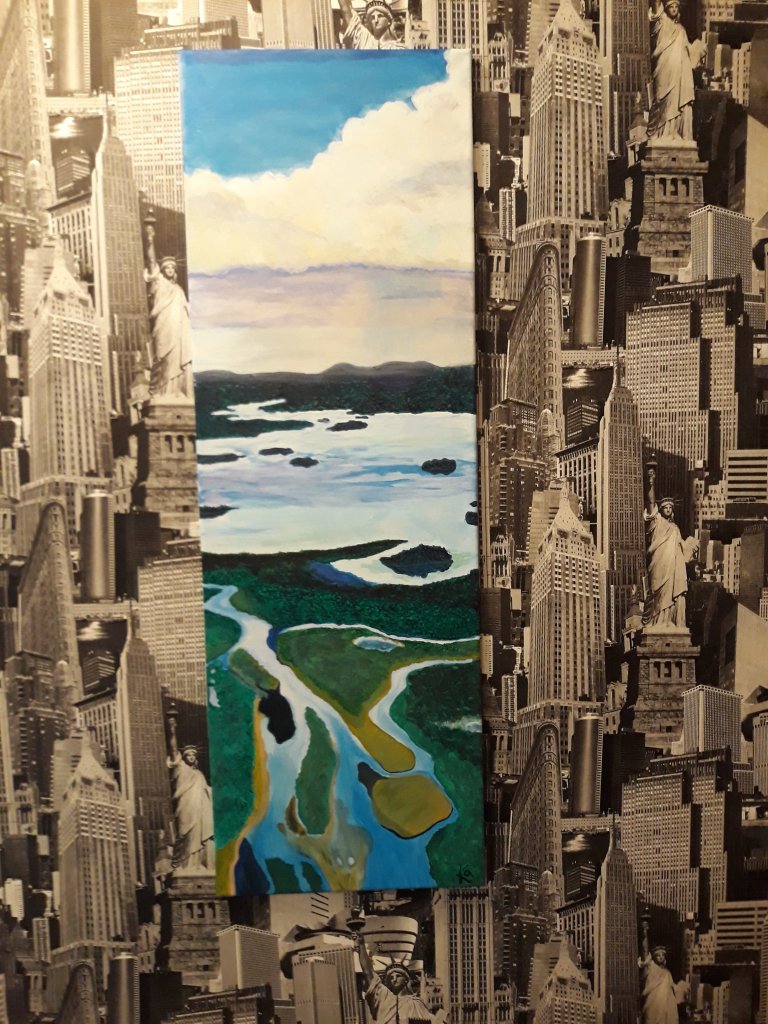 Jag gillar att skapa kontraster. I hallen har jag en fondvägg med New York i svart och vitt. Satt där när jag flyttade in och har ännu inte tagit bort den. Då passar det ju utmärkt att skapa lite kontraster med en naturtavla. 😊
