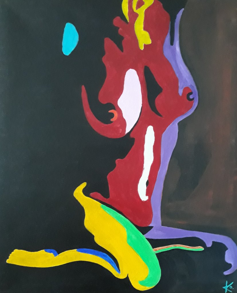 Fortsätter måla i färg på svart bakgrund. Gillar kontrasten mellan skarpa färger och svart. Det är kul att måla och denna gången blev det ännu en sittande kvinna. Men i lite annan stil. 🙂